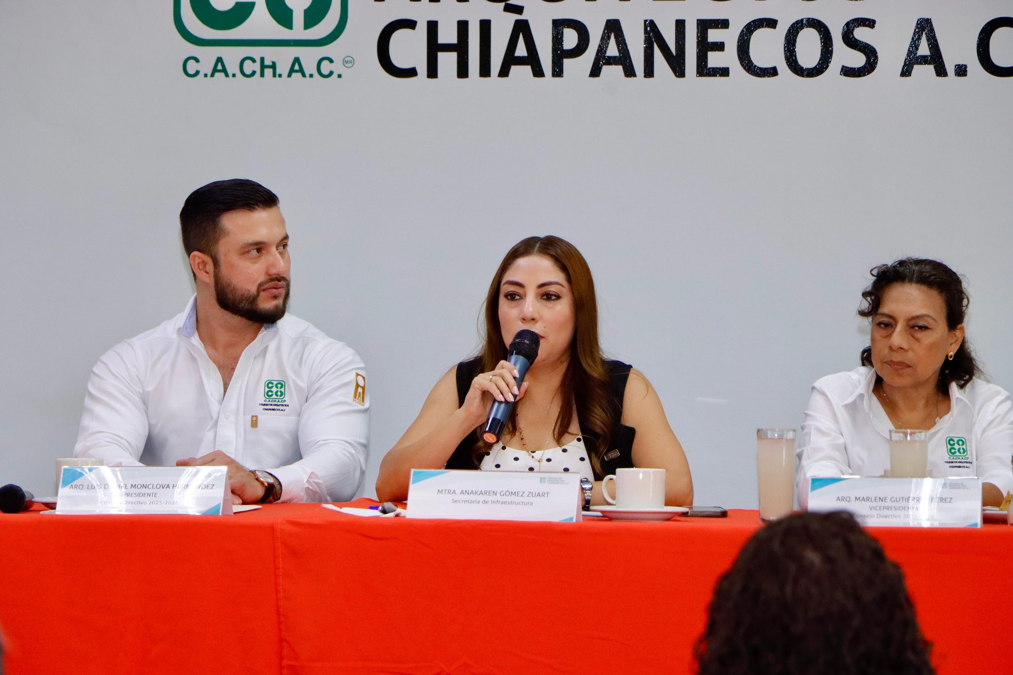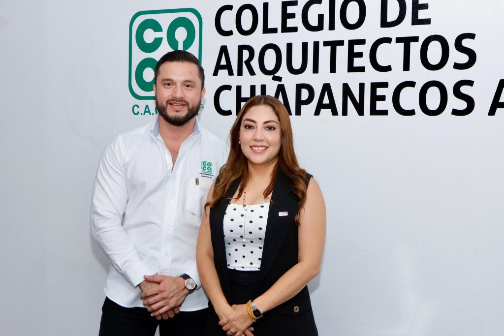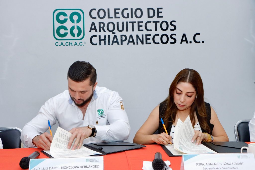 El presidente del Consejo Directivo 2025-2026 del Colegio de Arquitectos Chiapanecos A.C., Arq. Luis Daniel Monclova Hernández y la titular de la Secretaría de Infraestructura Chiapas, Mtra. Anakaren Gómez Zuart, firmaron este jueves, convenio de colaboración, con el propósito de impulsar una colaboración efectiva en favor del gremio y la sociedad chiapaneca.