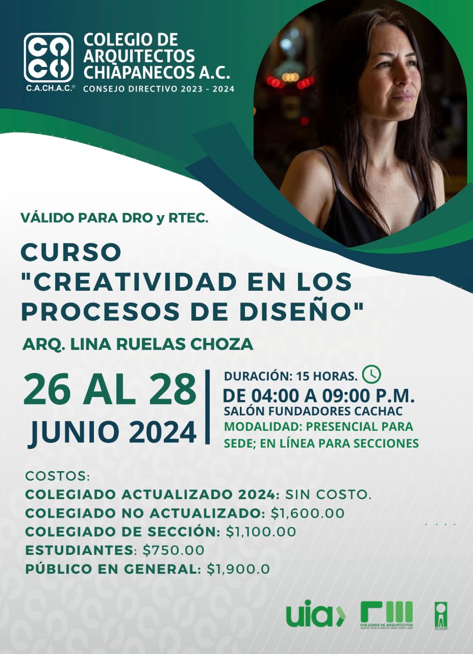 Te invitamos al curso «Creatividad en los Procesos de Diseño» que será impartido por la Arq. Lina Ruelas Choza del 26 al 28 de junio de 2024 de 4:00 a 9:00 P.M. en el Salón Fundadores del CACHAC.