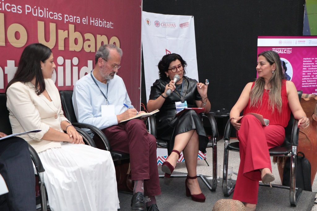 José Antonio Villanueva Santiago, director del ICIPLAM Tuxtla, Juma Assiago, oficial de Programa Suelo, Vivienda y Refugio, ONU-Hábitat, Kenia; Victoria Paulina Rodríguez Mosqueda, de la Universidad de América Latina, Celaya, México; y vicepresidenta Región Zona Norte, Federación Panamericana de Asociaciones de Arquitectos (FPAA); Claudia Rivera Vivanco, diputada Federal y secretaria de la Comisión de Federalismo y Desarrollo Municipal del Congreso de la Unión, México.