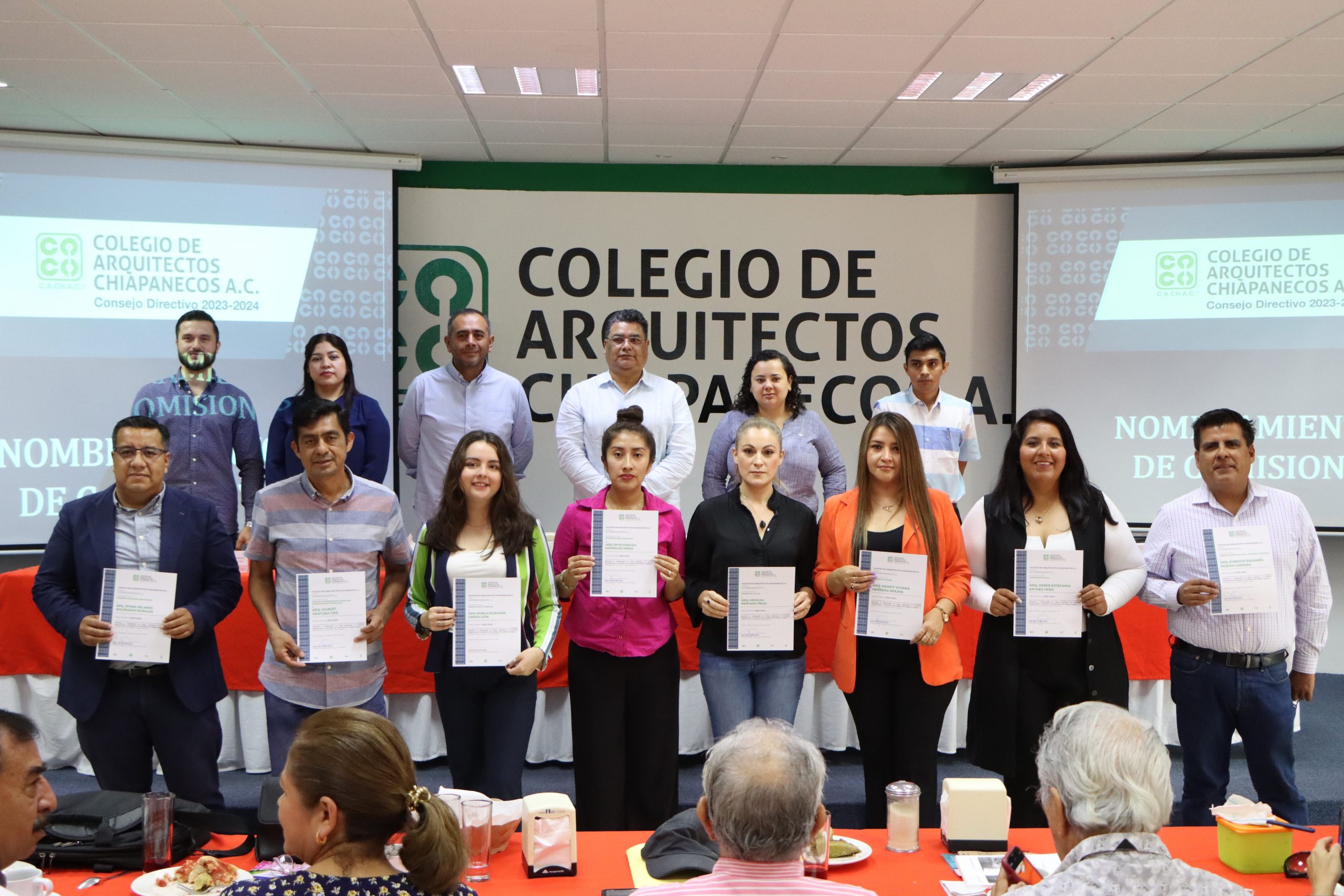 Tuxtla Gutiérrez, Chiapas.- Con la nutrida participación de los agremiados y en el marco de los desayunos tradicionales, integrantes del Consejo Directivo hicieron entrega de los nuevos nombramientos a coordinadores de Comisiones para el bienio 2023-2024.
