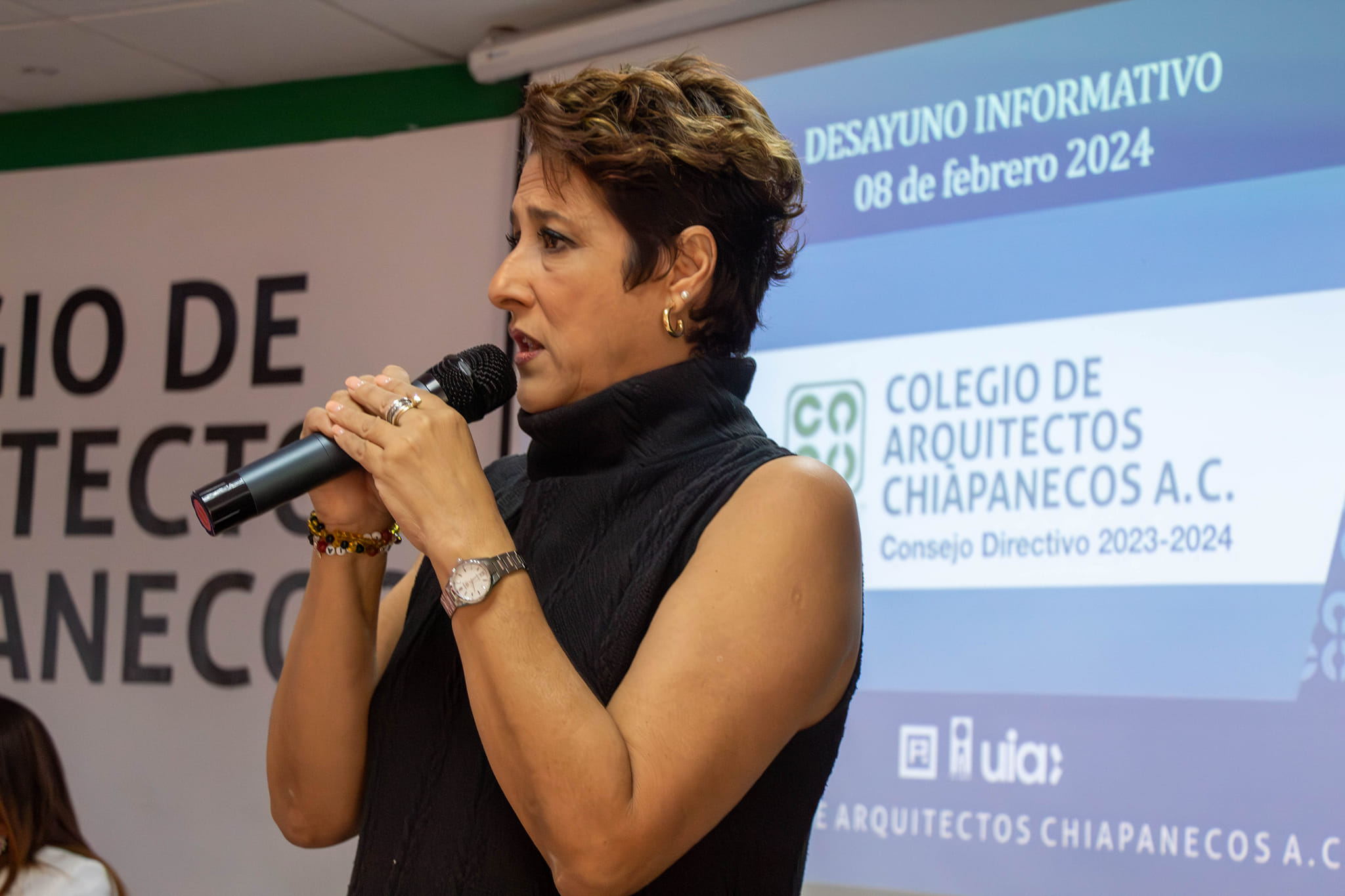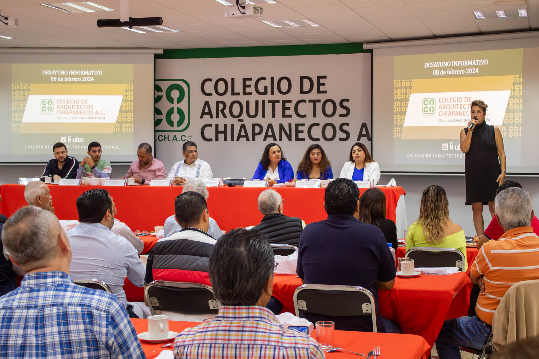 En el marco del tradicional Desayuno Gremial, el Colegio de Arquitectos Chiapanecos A.C. tuvo como invitada especial a la secretaria de Obras Pรบblicas del Gobierno del Estado, Mtra. Claudia Baca Esquinca.